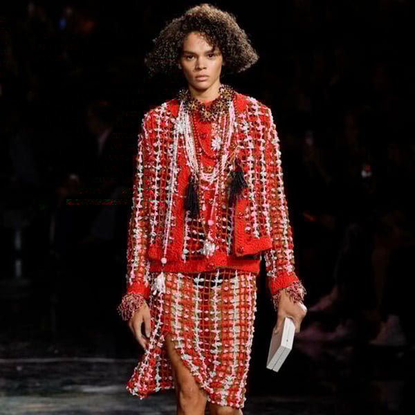 Bold, gutsy, ingenious, often beautiful and curiously risqué, the debut collection by Matthieu Blazy was the undoubted hit of the season. Blazy practically reinvented the classic Chanel suit with a new knee-length wrap skirt made with pockets, generally left frayed and finished in filigrees of gold. And instead of just wool bouclé, it came in impossibly airy plaids, windowpane checks, or stiff denim. Disrupting codes: conceptual double-sized camellia brooches, woven pearl necklaces, Coco’s beloved wheat embroidered into organza tops. Plus, Matthieu’s magnificent Solar System set of giant gas-filled, internally illuminated planets brought Chanel back to the glory days of Karl Lagerfeld. Little wonder he got the season’s biggest ovation by far.